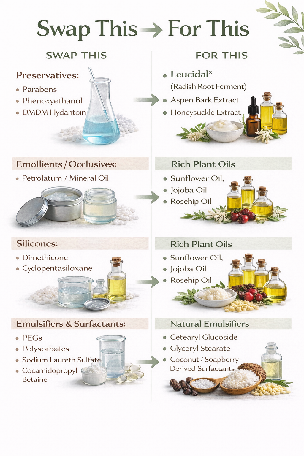 Not all synthetic ingredients are harmful, but many conventional skincare products rely on synthetic preservatives, fragrances, and petroleum-derived fillers to extend shelf life, create scent, or improve texture. Some of these ingredients have been associated with skin irritation, allergic reactions, hormone disruption concerns, or unnecessary chemical exposure—especially for people with sensitive, eczema-prone, or compromised skin.